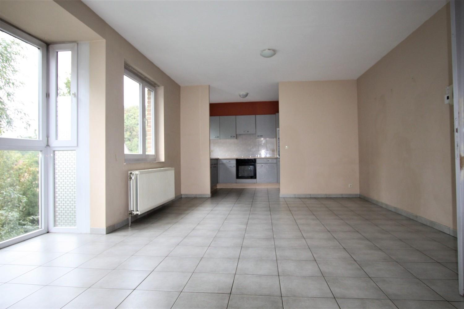 Het appartement omvat een inkom met trap, leefruimte met open keuken, berging/wasruimte, 2 kamers, badkamer, toilet en een autostaanplaats in de ondergrondse parking.
