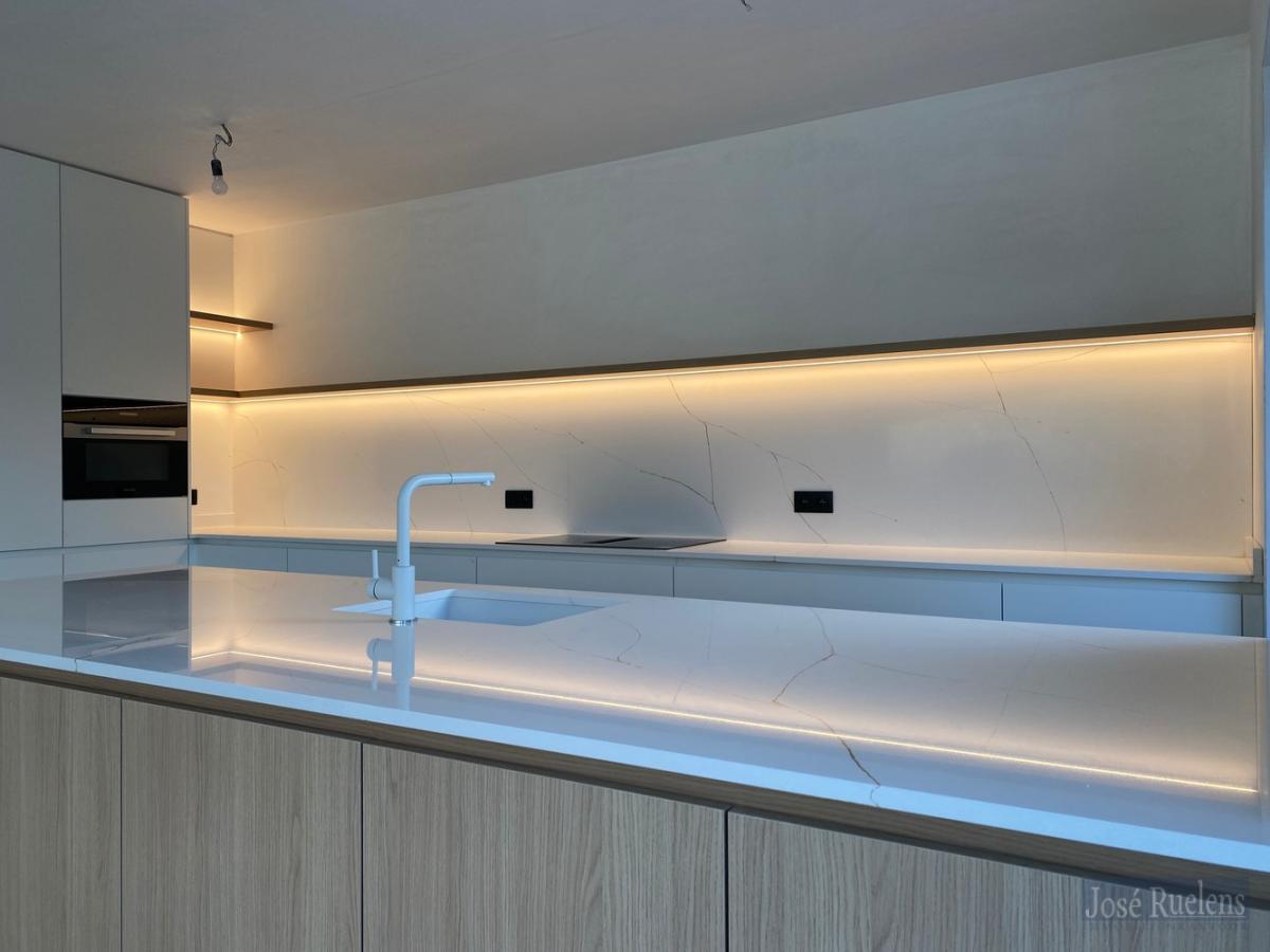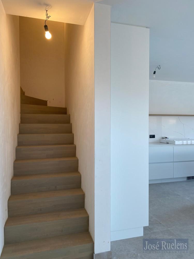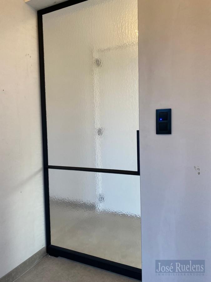 De woning bestaat gelijkvloers uit een inkom met plaats voor een vestiaire en een gastentoilet. Via een mooie zwarte glazen deur kom je in de volledig ingerichte leefkeuken. De keuken is voorzien van alle, kwalitatieve toestellen en een groot eiland met veel werkoppervlakte of plaats voor een ontbijthoek. De knusse woonkamer ligt vooraan en heeft veel mogelijkheden. Verder is er gelijkvloers nog een inpandige garage voor 1 wagen fietsen en voorzien van een uitgietbak en aansluiting voor een wasmachine.