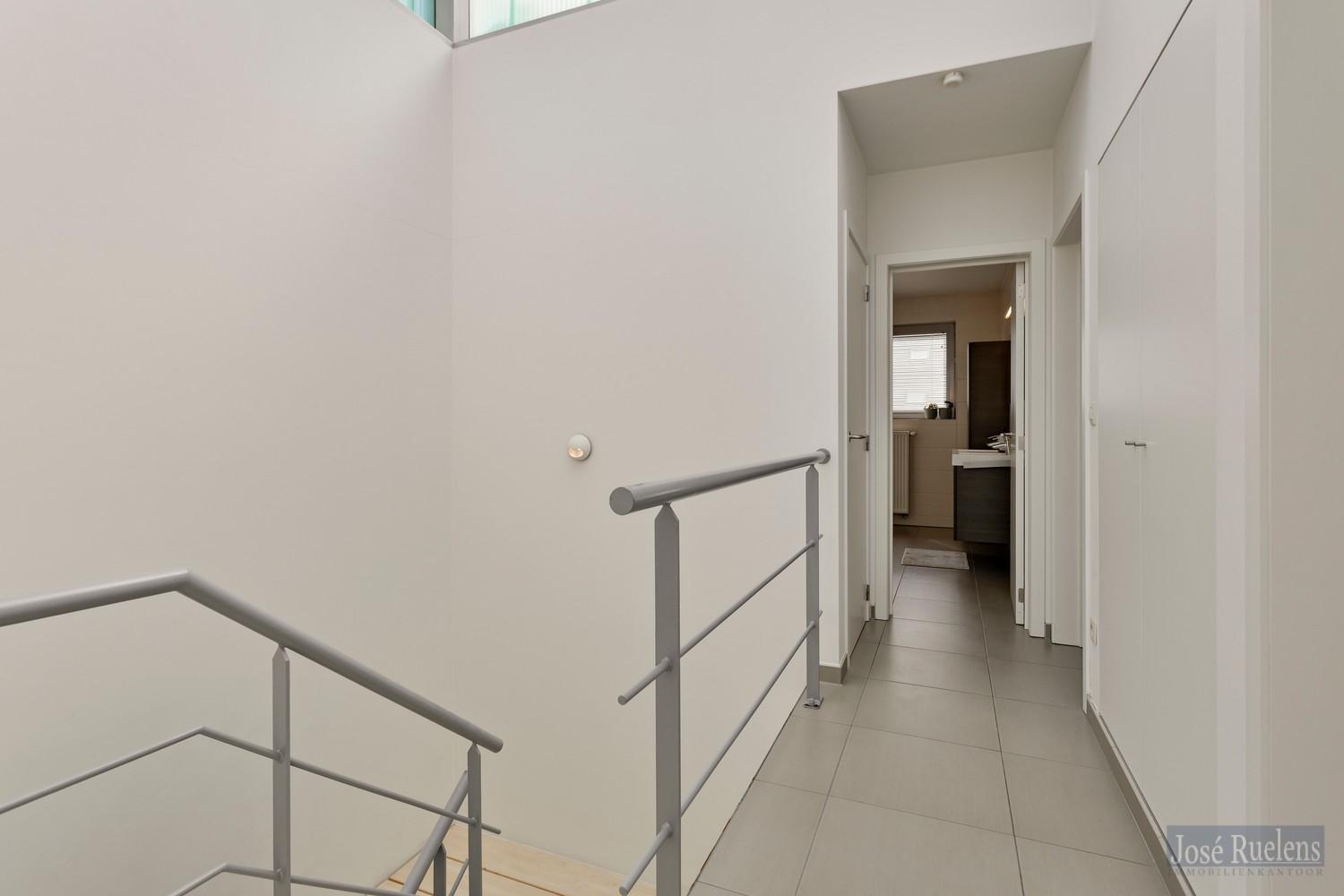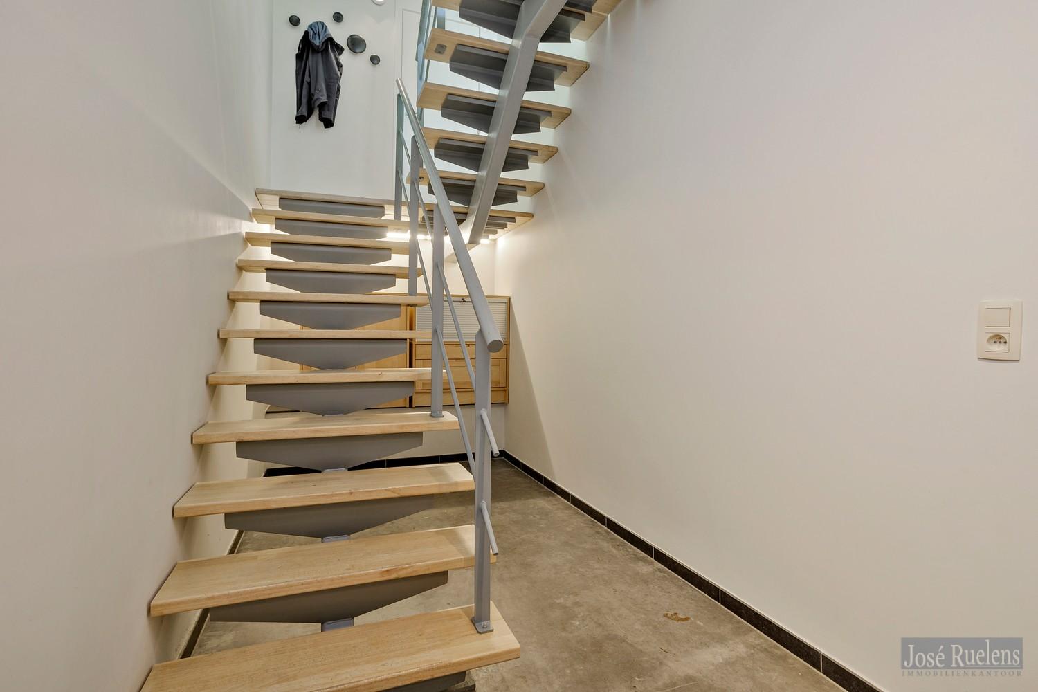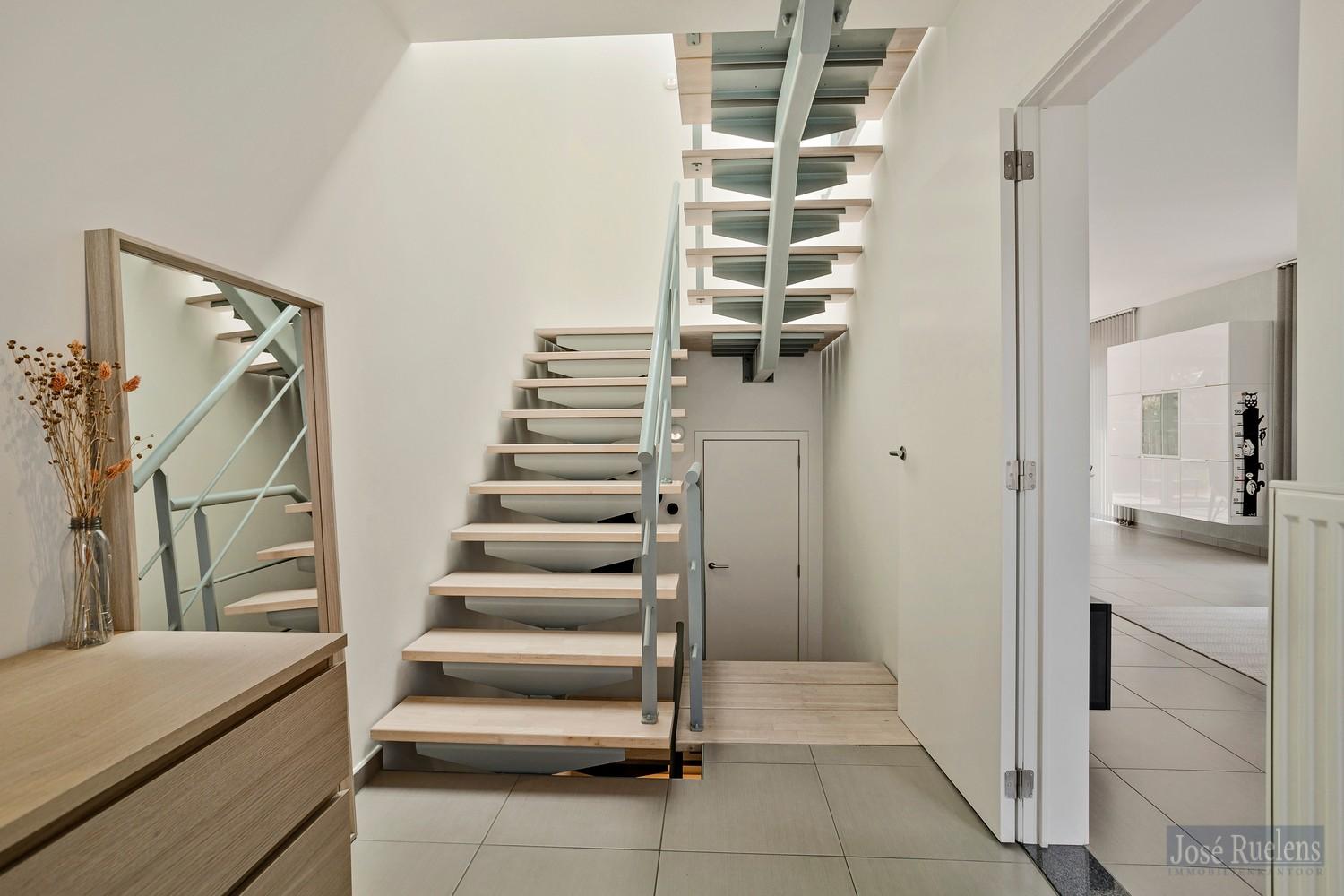U kan de woning betreden via een ondergrondse garage (mogelijkheid voor 2 wagens), langs de garage is er een wasplaats en de traphal voor naar de gelijkvloerse verdieping. Hier vindt men een inkomhal met toilet, leefruimte met open keuken. Via de 2de trap betreed je het verdiep en hier zijn drie kamers en de badkamer. Achter de woning is er gezellig tuintje, mooi afgescheiden van buren. Een grote koepel op het dak zorgt voor veel lichtinval in de woning.