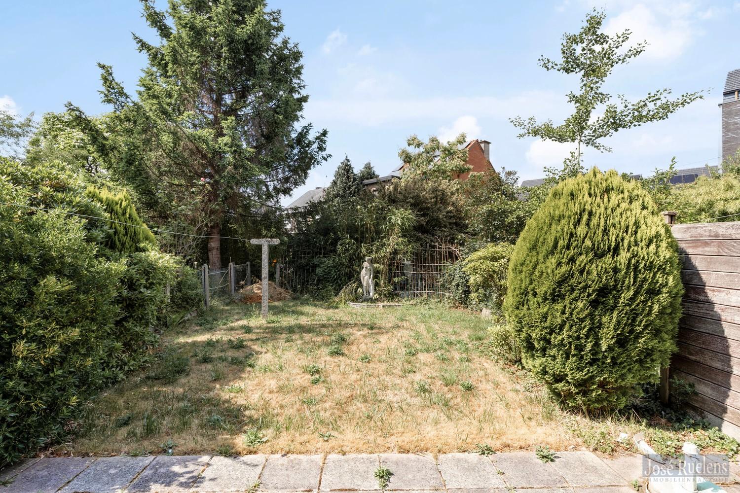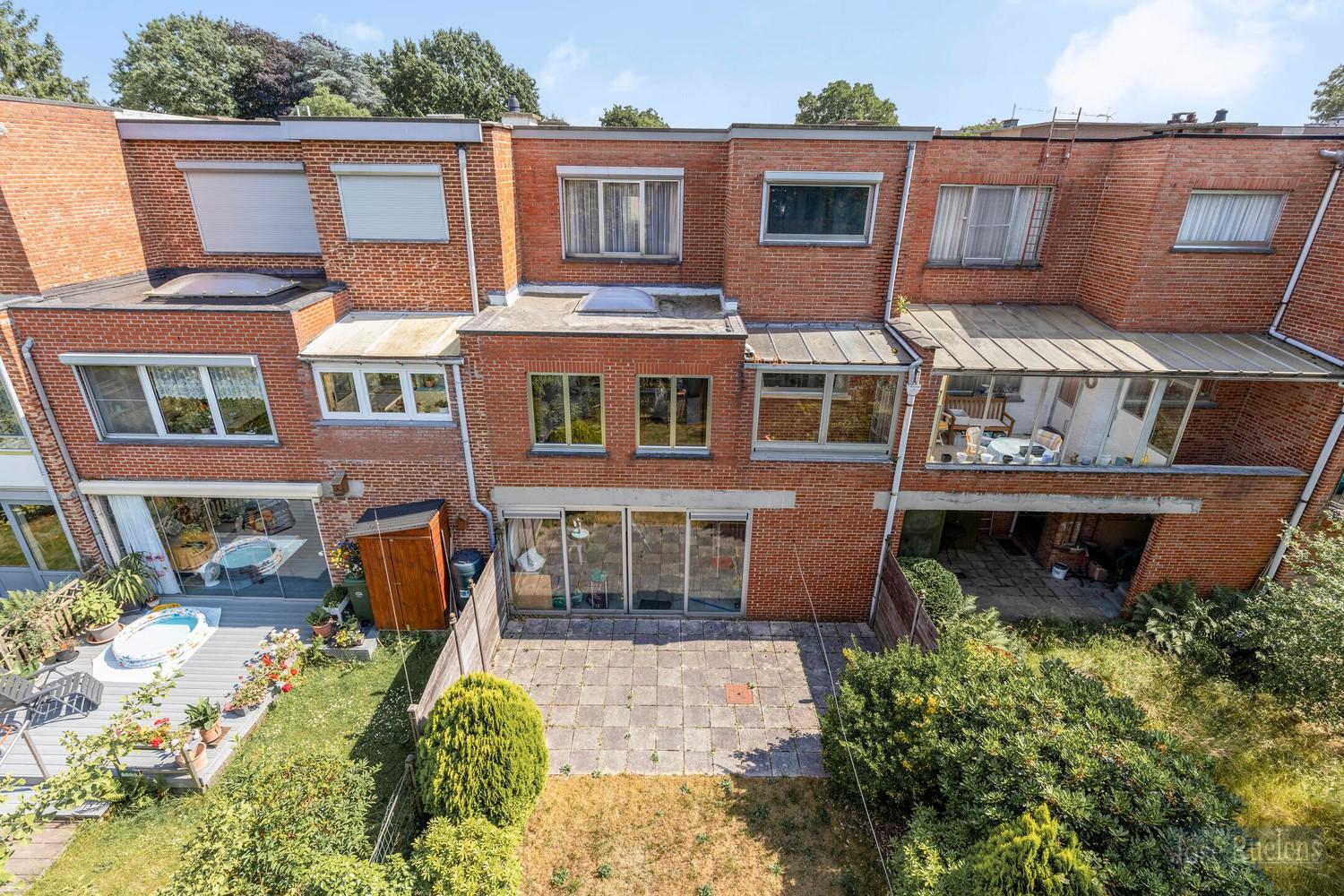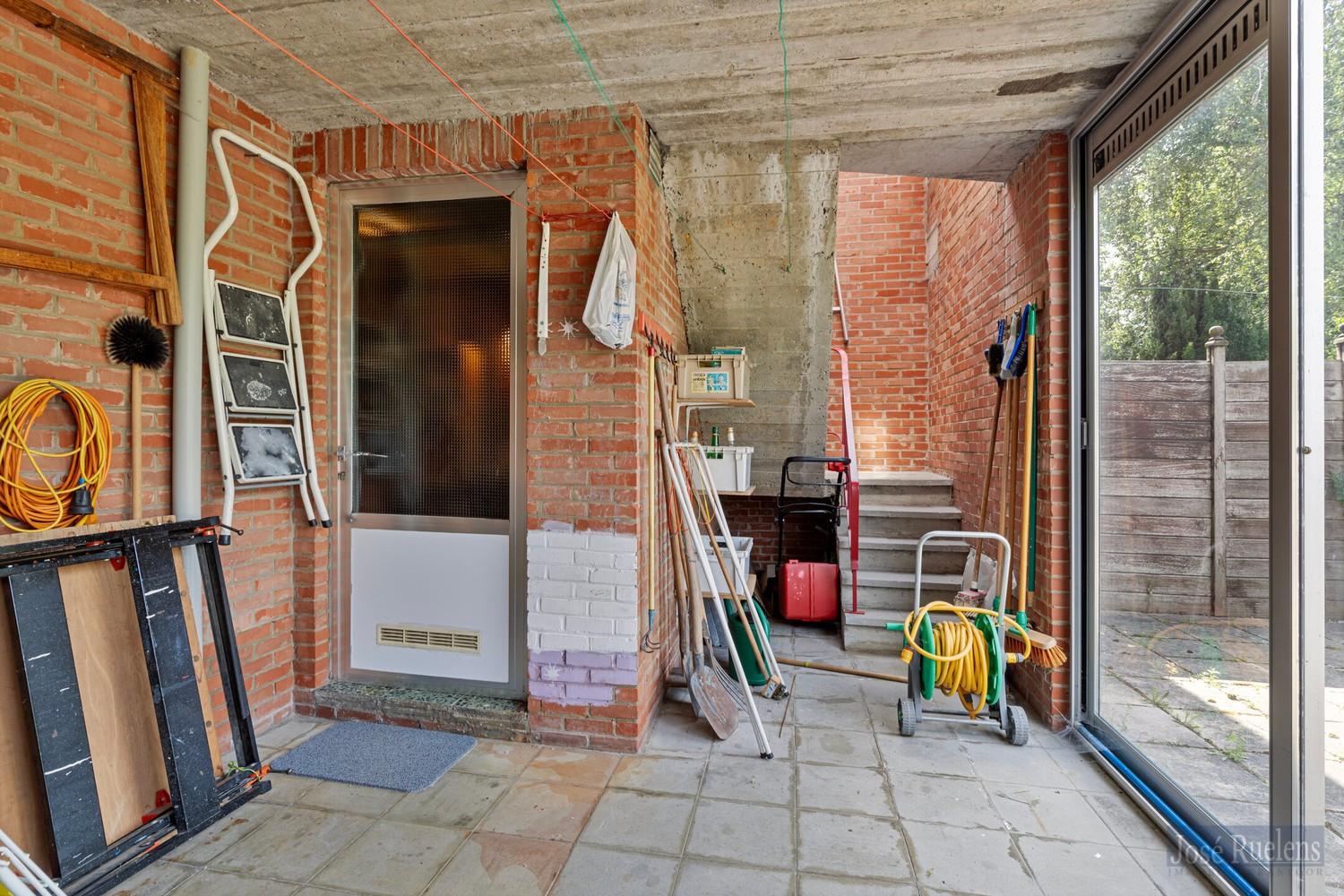 Op verdieping is er een overdekte terras en een trap naar de tuin.