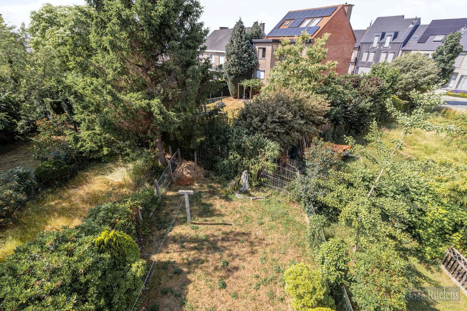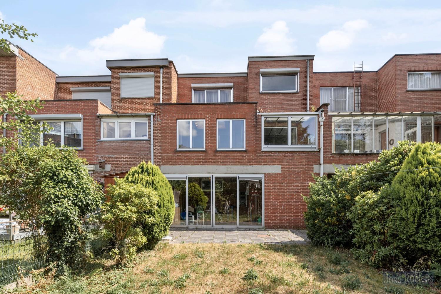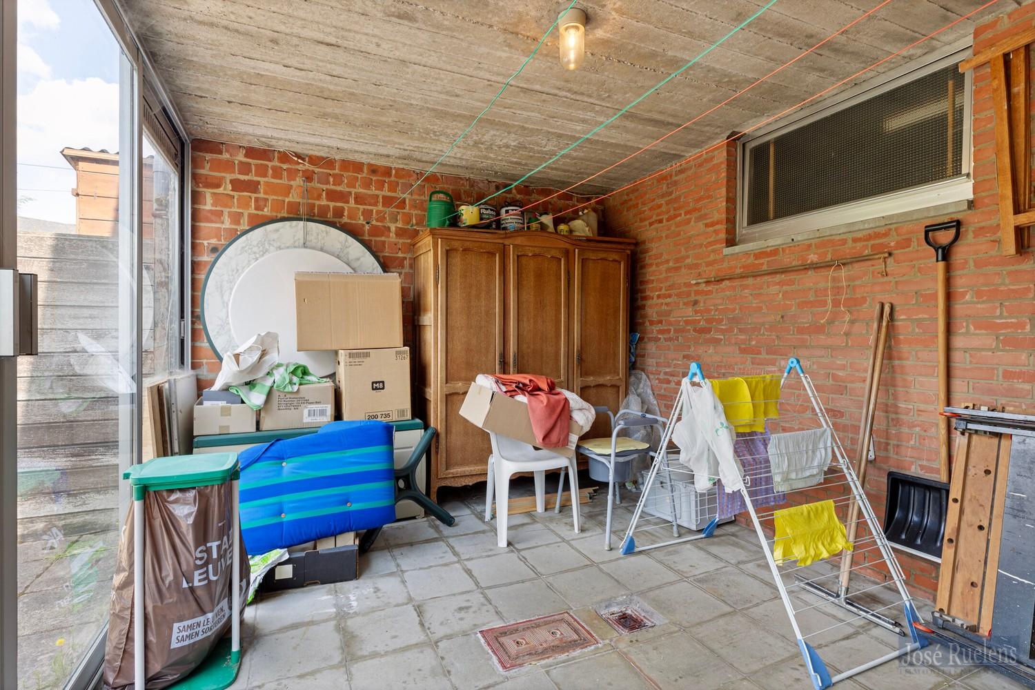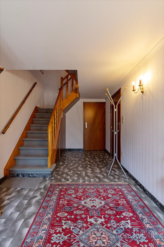 Op verdieping is er een overdekte terras en een trap naar de tuin.