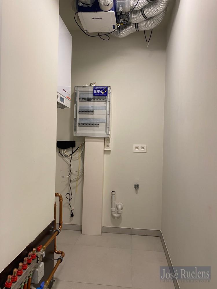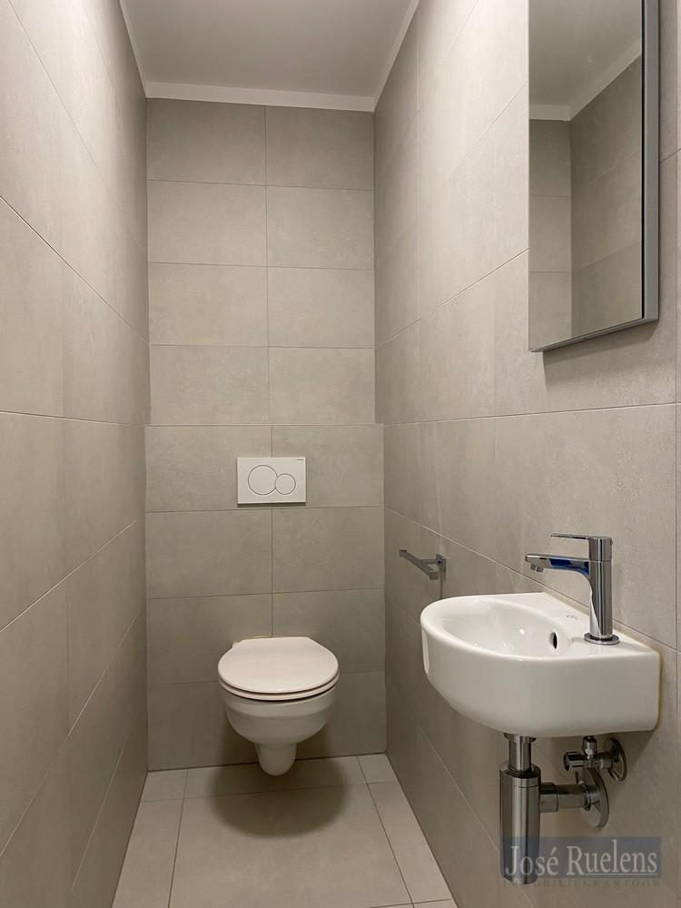 Het appartement omvat een ruime inkomhal met plaats voor vestiaire, een apart toilet, een berging met aansluiting voor een wasmachine, een lichtrijke open woonkamer met aansluitend de volledig geïnstalleerde keuken. Vanuit de woonkamer en keuken is er toegang tot een rustige terras achteraan.