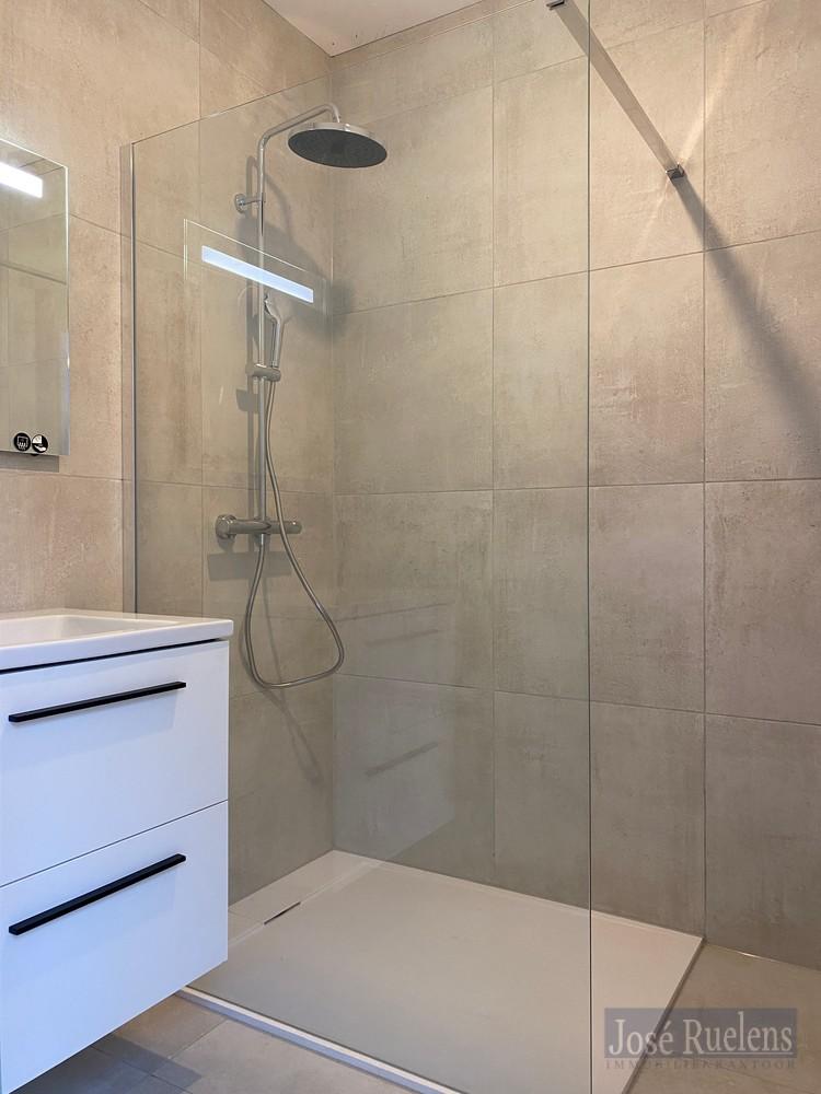 De woonkamer geeft toegang tot een leuk, overdekt hoekterras. Aan de volledig geïnstalleerde open keuken is er een aangename hoek voor een eettafel.