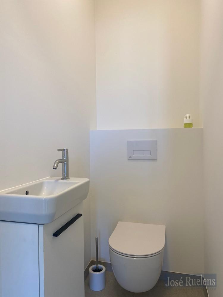 De ruime inkomhal beschikt over een gastentoilet en geeft toegang tot een zeer mooi, lichtrijke open leefruimte met een volledig geïnstalleerde keuken die een volledige wand beslaat en is uitgerust met onder andere een combi-oven en vaatwasser.