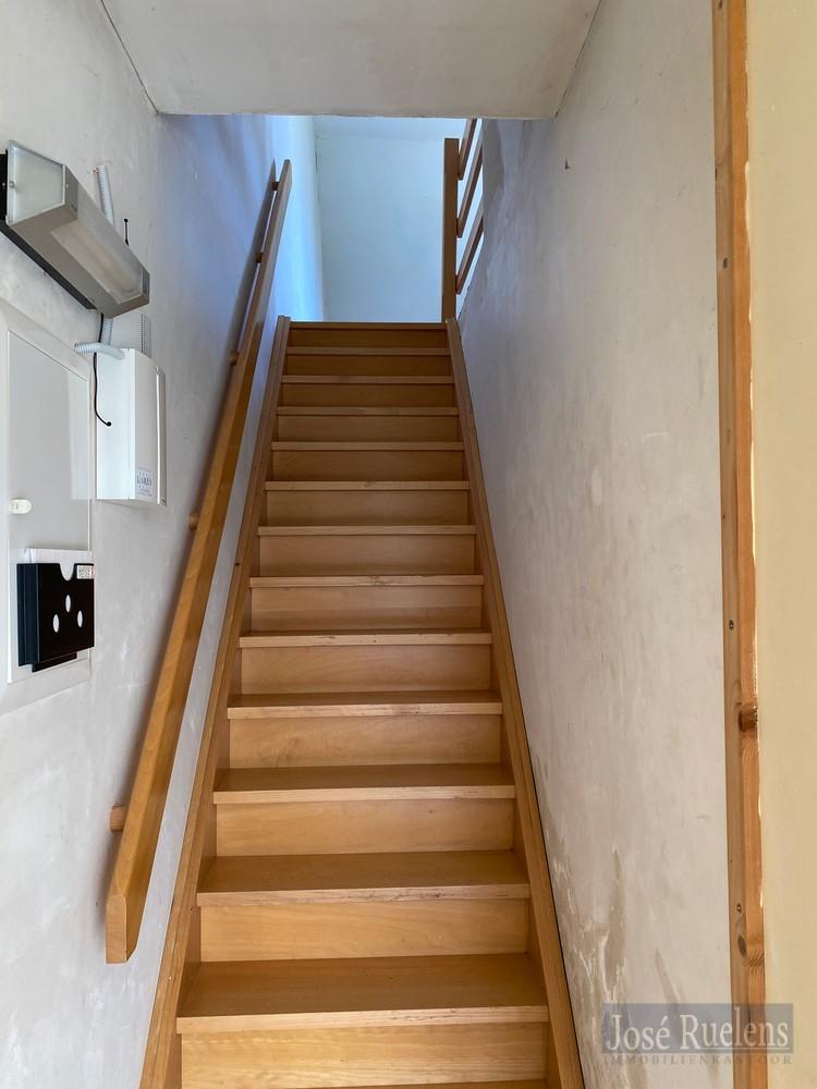 Vanuit de wasplaats is er een trap naar een mezzaninekamer die kan dienst doen als polyvalente kamer, slaapkamer of bureel.