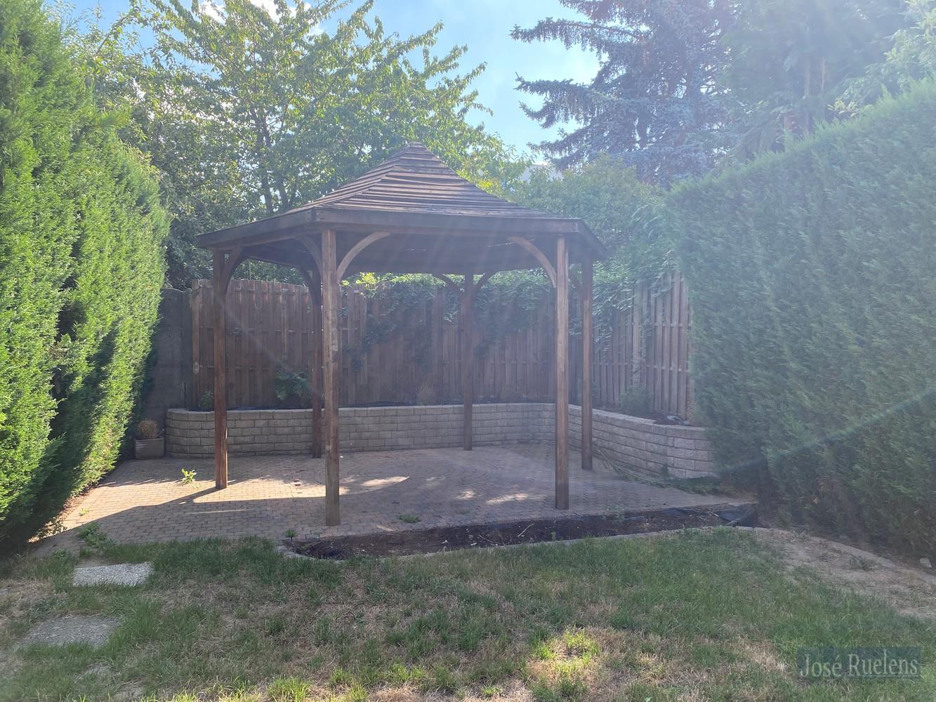 Verder is er nog een grote veranda met zicht op de aangename tuin, met zijn prieeltje